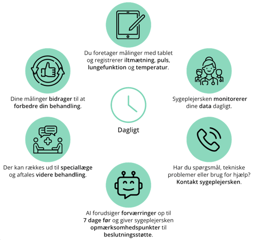 | Objektive målinger | SAT, puls, vægt | SAT, puls, vægt, FEV1, temperatur |